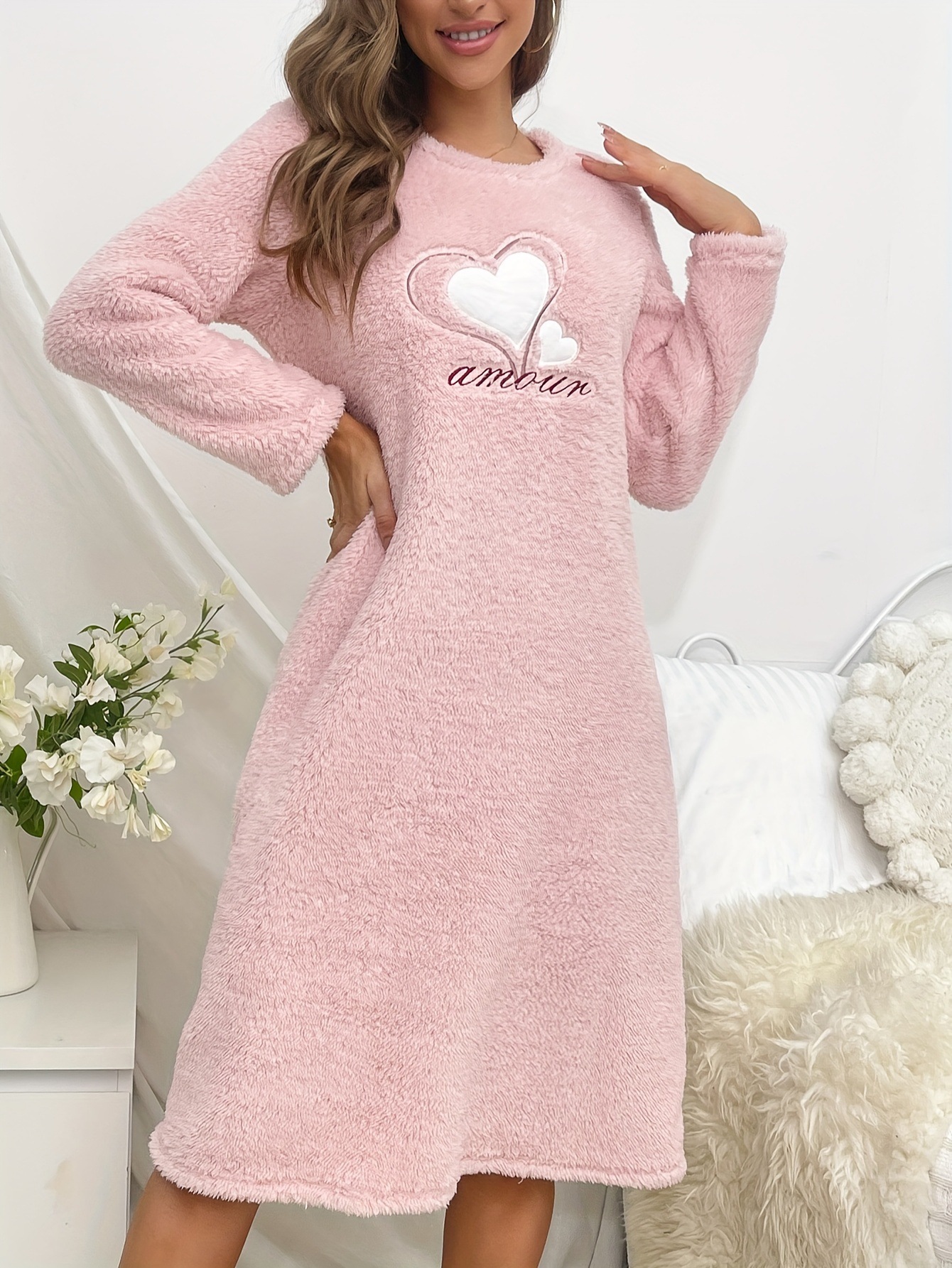 Foreign trade autumn and winter pink love flannel long sleeve padded nightgown pullover long cute European and American style home clothes