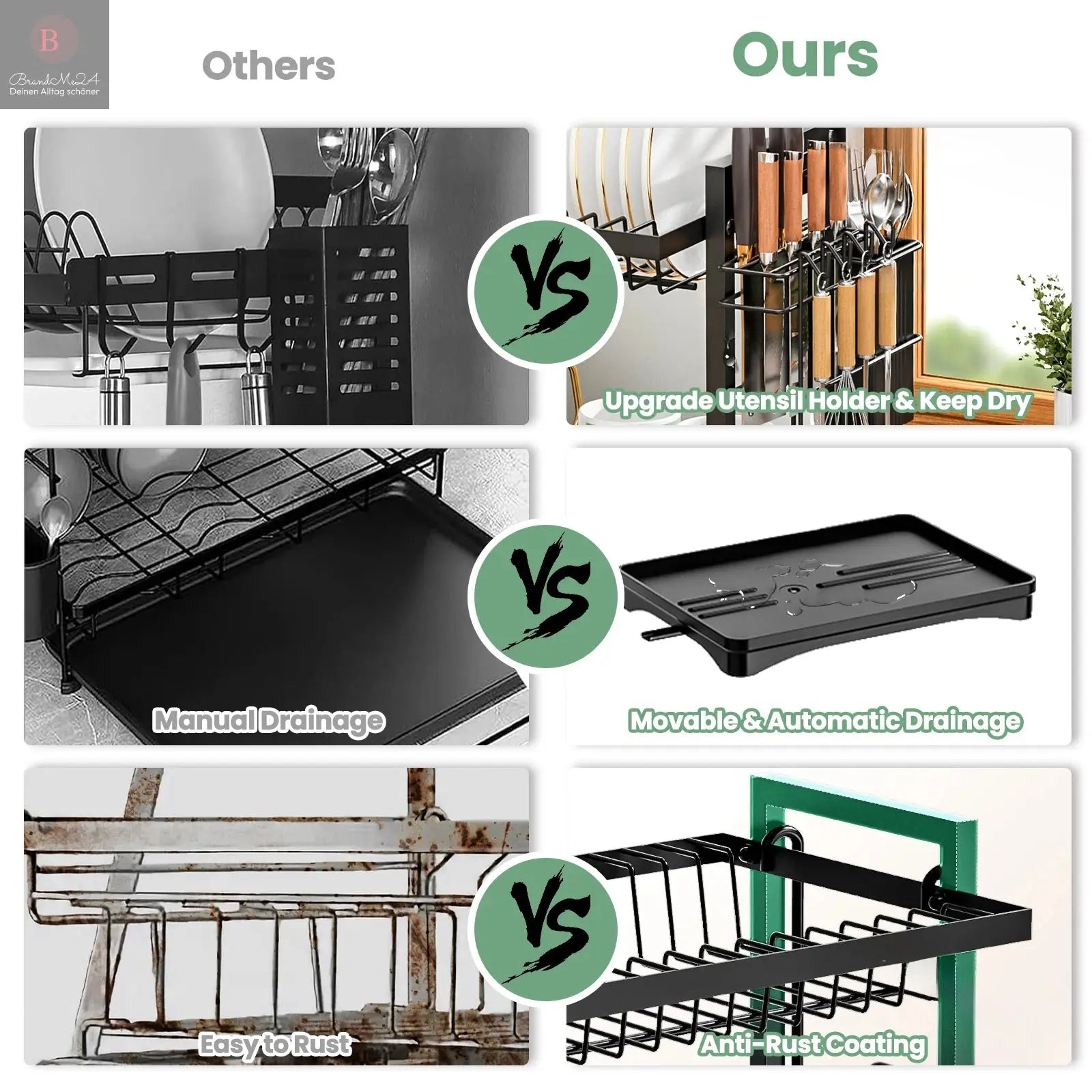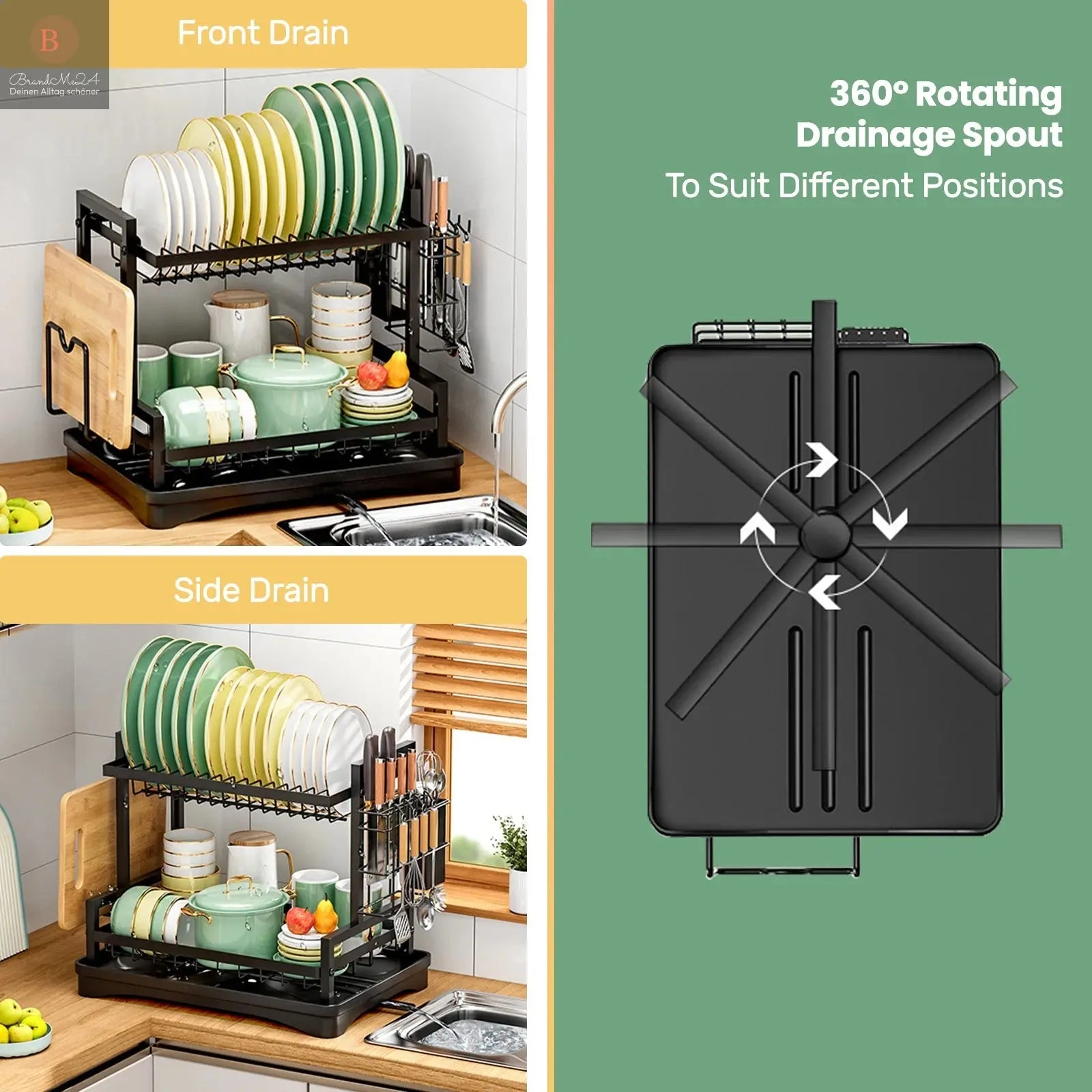 AUTOMATIC DRAINAGE SYSTEM: Sink drainer rack is designed with a removable drain plate to ensure that water flows to the sink and prevents water leakage on the work surface. The retractable rotating nozzle can rotate 360°. You can choose to adjust the position of the dish rack to adapt to the sink, effectively preventing water accumulation.