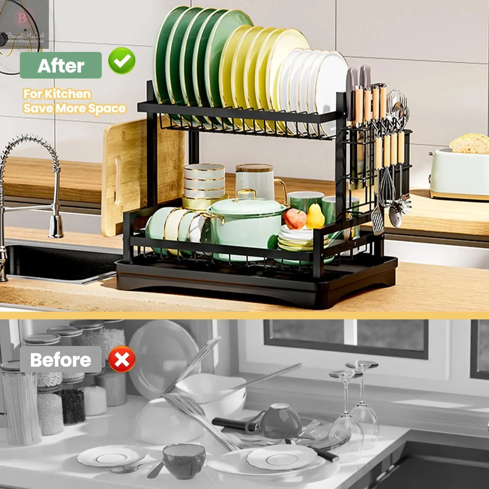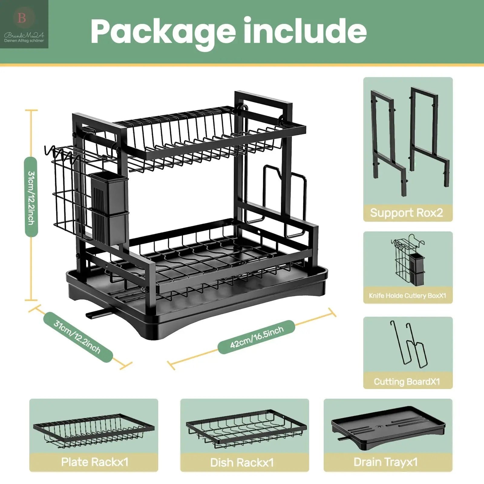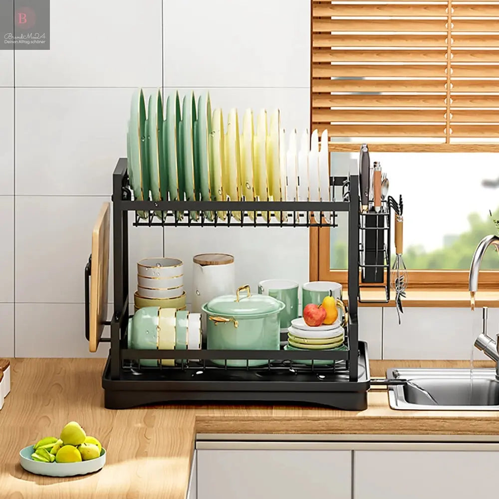 LARGE CAPACITY DISH RACK: Dish drying racki s double-layered and measures 16.5*12.2*13 inches. The top and bottom of the dish rack can hold dishes, cups and other kitchen items. The cutlery drying basket on the side is perfect for drying cutlery, and the other side is a cutting board rack.