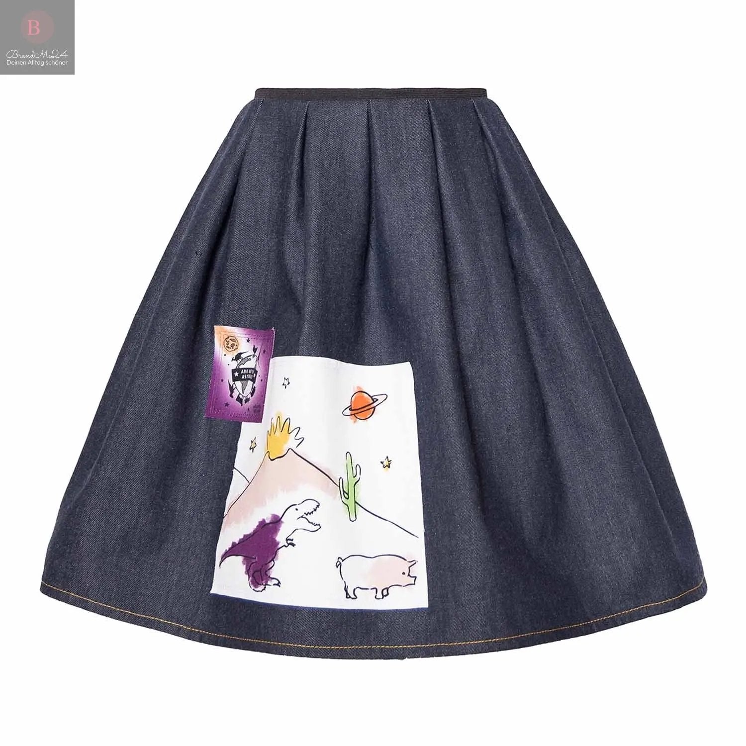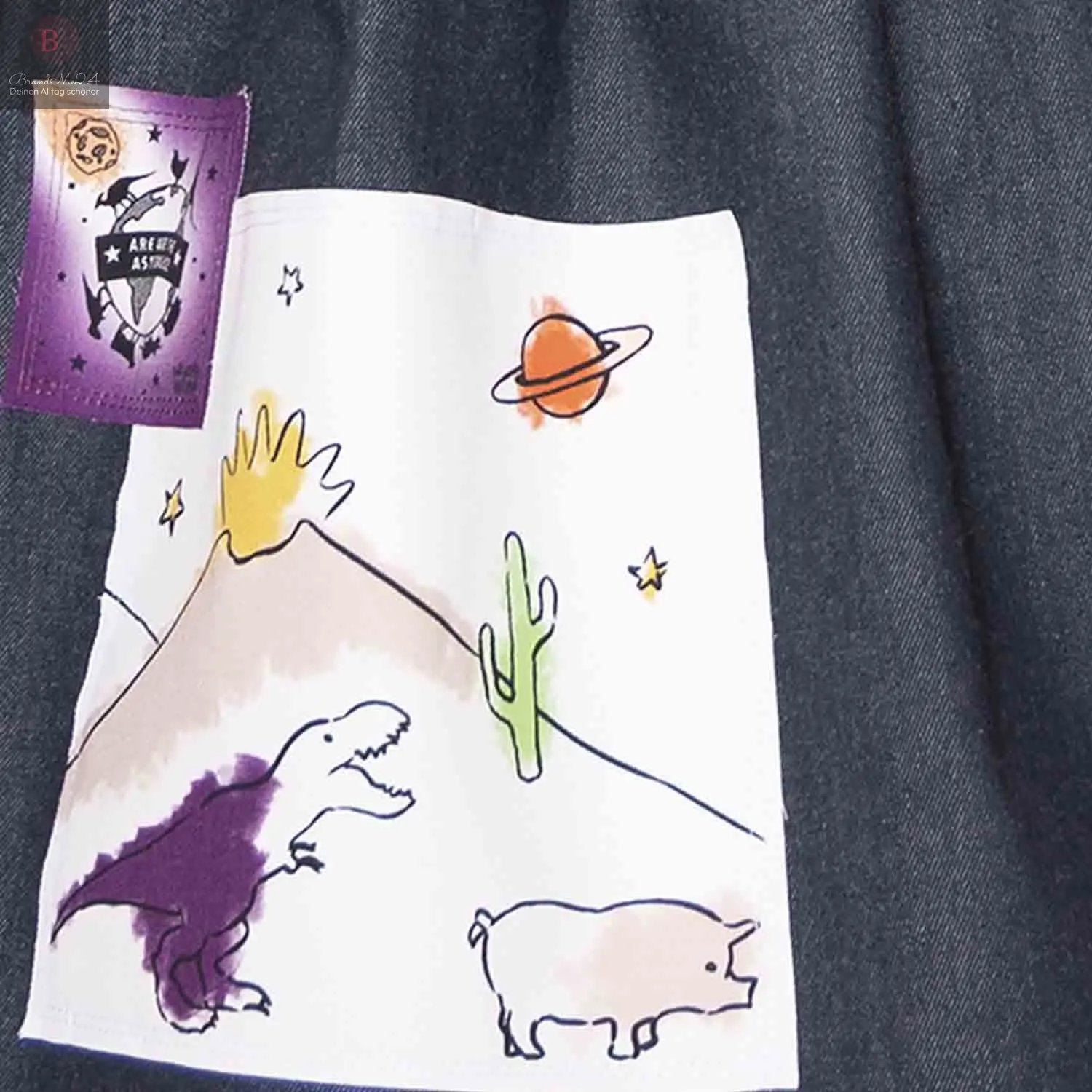 The blue denim skirt is a timeless piece that stands out because of its unique appliqué details. Appliqué designs add personality and flair, making the skirt not only a wardrobe staple but also a statement piece. The combination of vibrant colors in the appliqué and the classic blue denim creates a fun contrast, so it's perfect for both casual outings and semi-formal events.