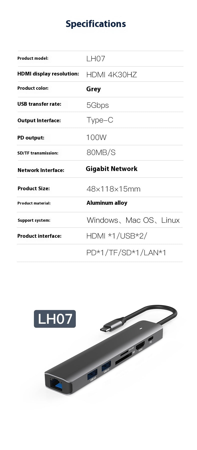 Product information: Model: LQT-LH07 Printed LOGO Customized processing: Yes With external power supply or not: no external power supply Number of interfaces: 7 in one