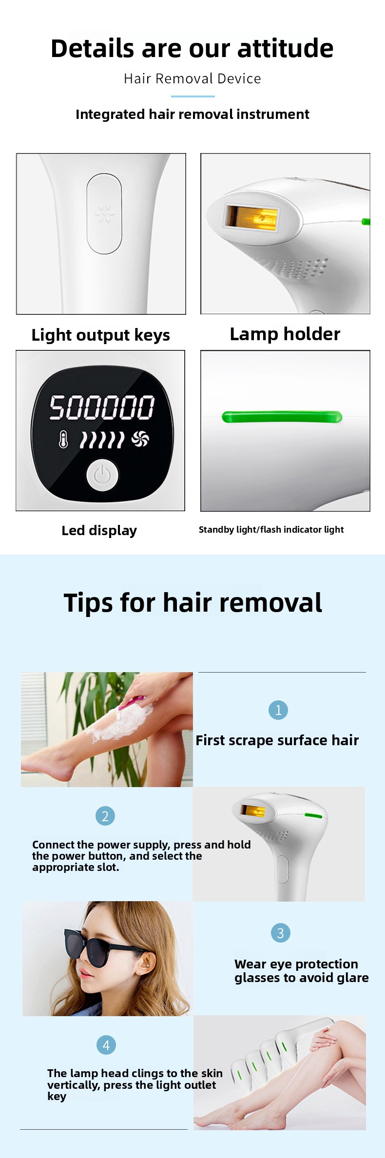 IPL Technology: Utilizes 470-1200nm wavelength for effective hair reduction.